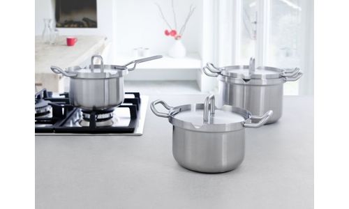 De BK Q-linair Master pannen hebben een hoge geborstelde roestvrij edelstalen body en zeer hoog geplaatste grepen. Hierdoor kunnen er extra grote porties in één keer bereid worden en zijn de pannen zeer compact stapelbaar. De deksels kunnen in de rand, onder de greep, vergrendeld worden om veilig afgieten mogelijk te maken. De BK Q-linair Master is voorzien van een ingekapselde sandwichbodem die zorgt voor een snelle opwarming en perfecte warmteverdeling door de hele pan.