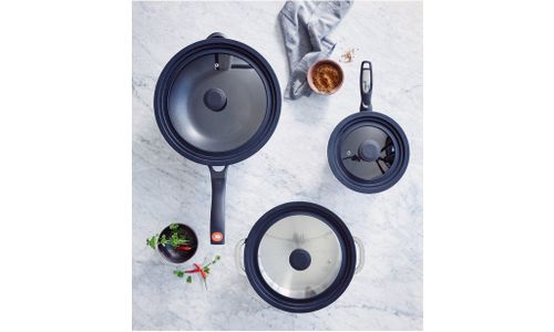 Onze universele deksels zijn er in 3 verschillende maten om op een breed scala kookgerei van 16 cm tot 32 cm te passen. De siliconen ringen maken het mogelijk één deksel op 3 verschillende maten potten en pannen te gebruiken.