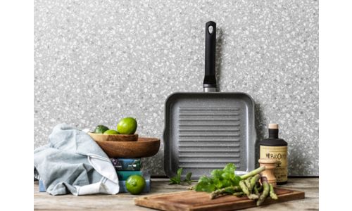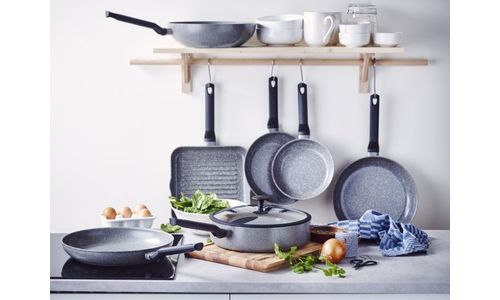 Met deze speciale BK serie bak je gezond op alle warmtebronnen. De hippe stonelook coating en een stevige kunststof greep maakt deze pannen een opvallende verschijning op elk fornuis. De hoogwaardige keramische non stick-coating (PFAS-vrij) kan tegen een stootje en is perfect voor het bakken of braden zonder of met weinig oliën of vetten. De ergonomische koudgreep zorgt voor een veilige grip onder alle omstandigheden. De pan is geschikt voor alle warmtebronnen, kan in de oven (tot 160°C) en kan na gebruik in de vaatwasser.