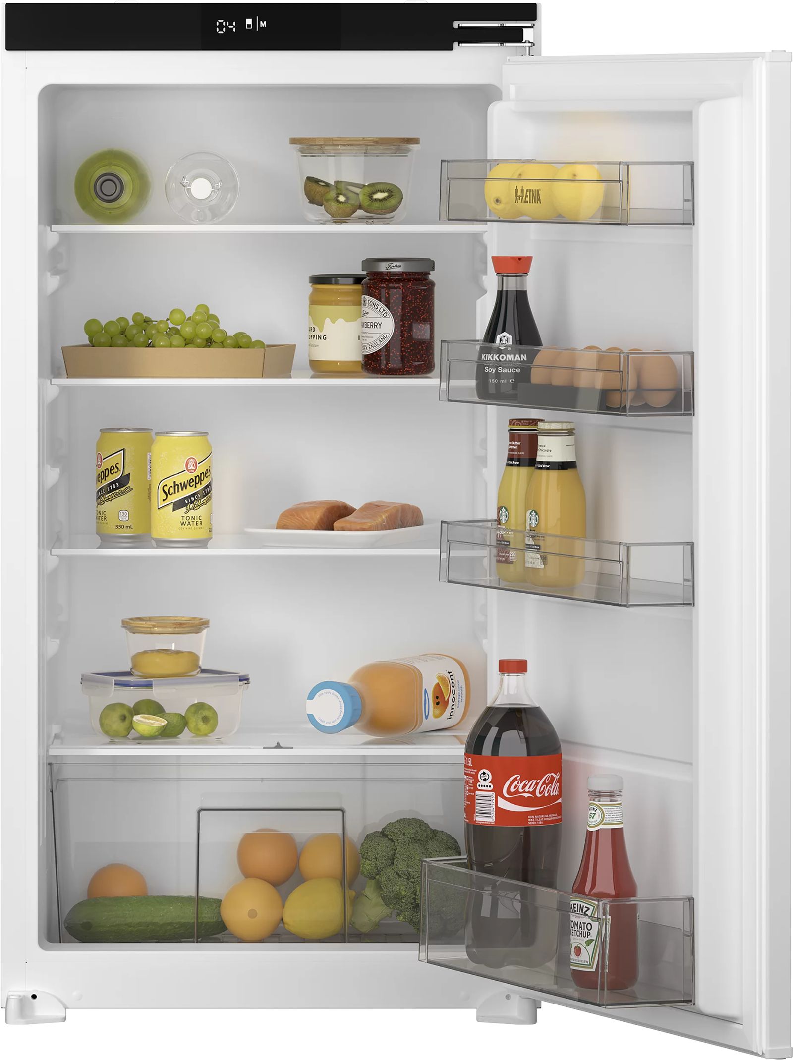 Het koelgedeelte van deze koelkast heeft een netto inhoud van 154 liter en biedt veel opbergruimte. Zo heeft de KKS7102T vier glazen legplateaus van veiligheidsglas en een transparante groentelade met luchtvochtigheidsregeling. De inbouw koelkast is 102 cm hoog en wordt ingebouwd met het veelgebruikte sleepdeursysteem. Bovendien is de draairichting van de deur voor het inbouwen te bepalen, zodat hij altijd past bij het ontwerp van de keuken. De KKS7102T is voorzien van elektronische thermostaat met led-display en touch control bediening. Met de SuperCool functie breng je nieuwe boodschappen snel op de juiste temperatuur. Deze koelkast is voorzien van een alarm bij open deur en bij te hoge temperaturen.