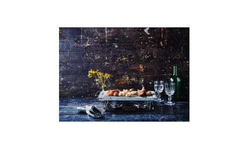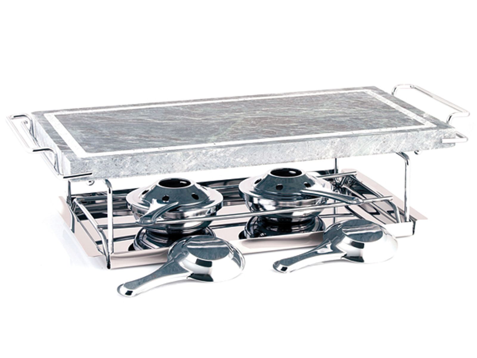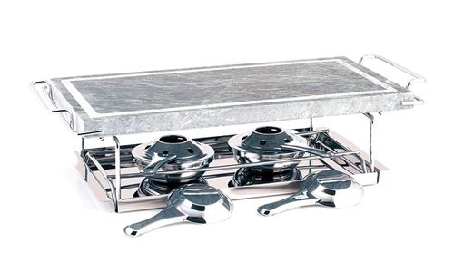 - De roestvrij stalen houder en steen kunnen vervolgens op het dienblad aan tafel worden geplaatst, zodat gasten hun eigen eten kunnen grillen. Gezelligheid verzekerd!